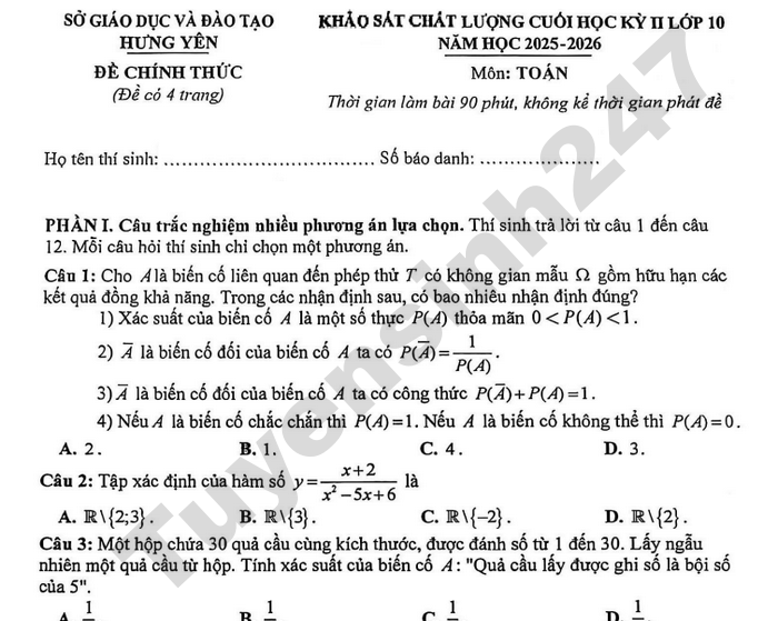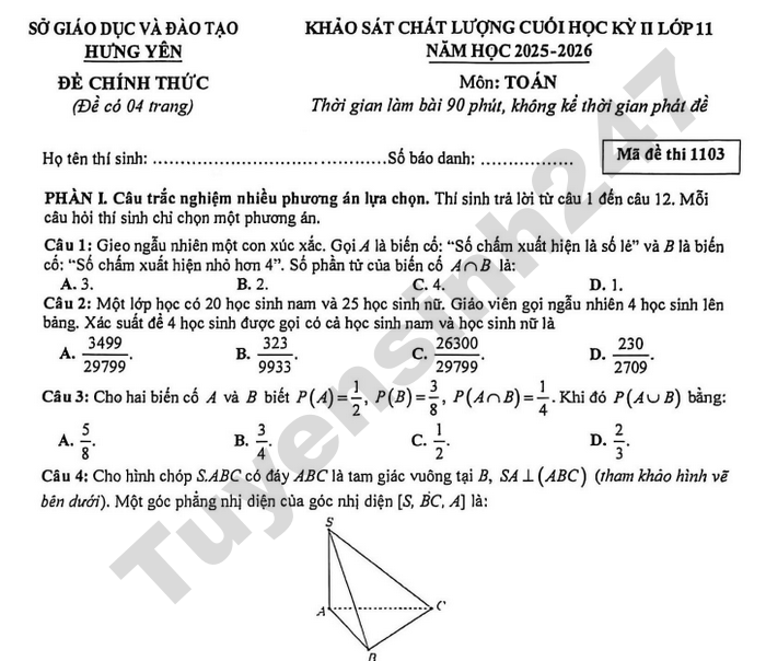 Đề thi khảo sát chất lượng cuối học kì 2 lớp 9 môn Toán năm học 2025 - 2026 của Sở GD-ĐT Hưng Yên nội dung chi tiết như sau: