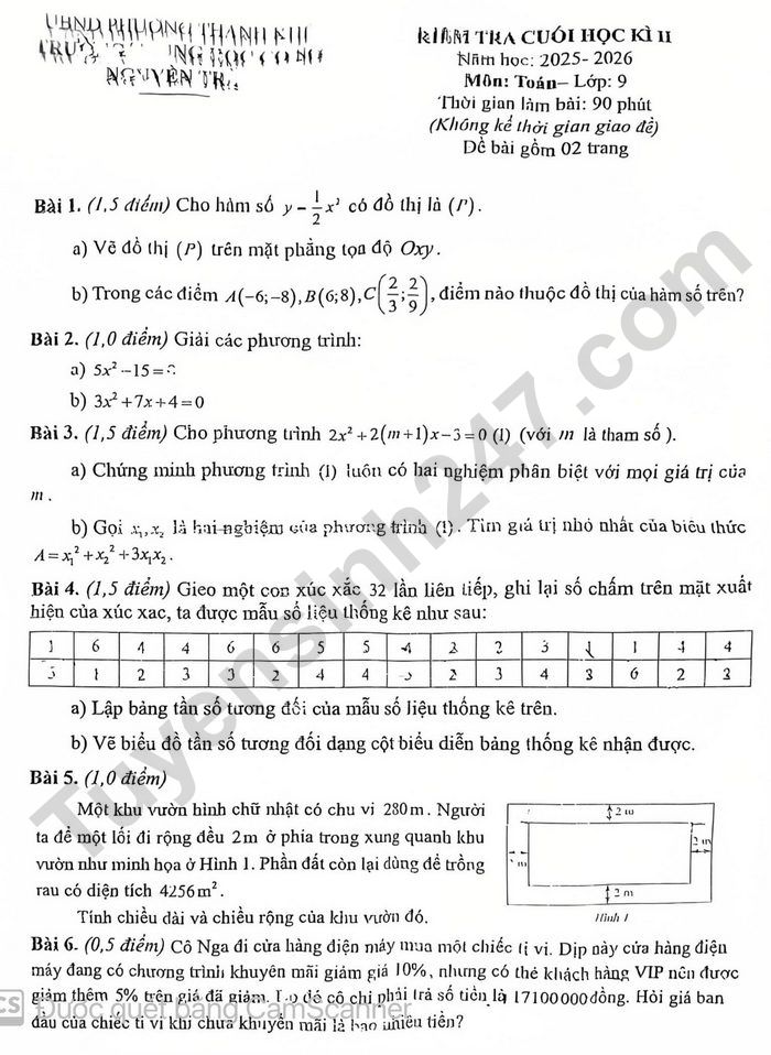 Đề thi học kì 2 năm 2026 lớp 9 môn Toán - THCS Nguyễn Trãi